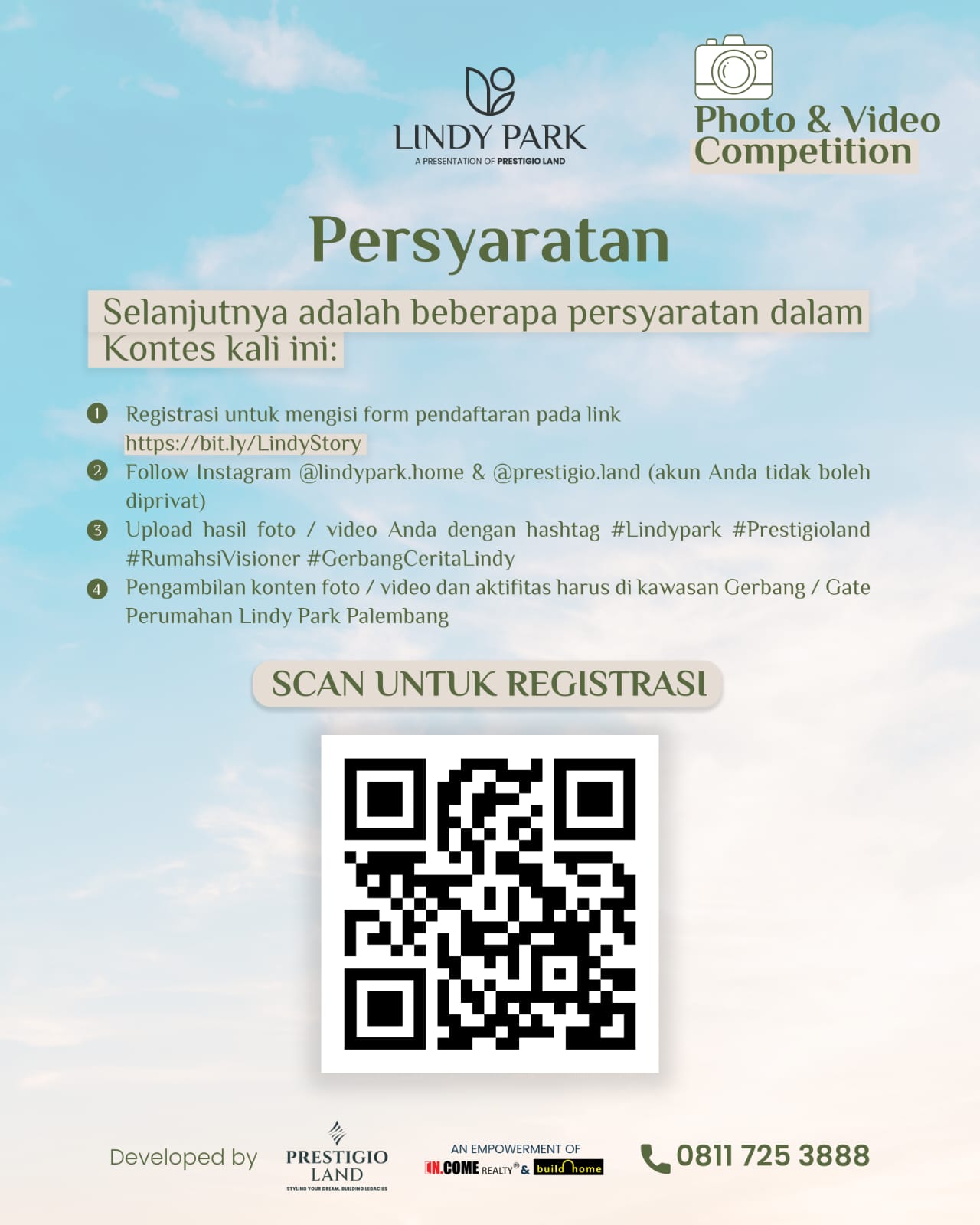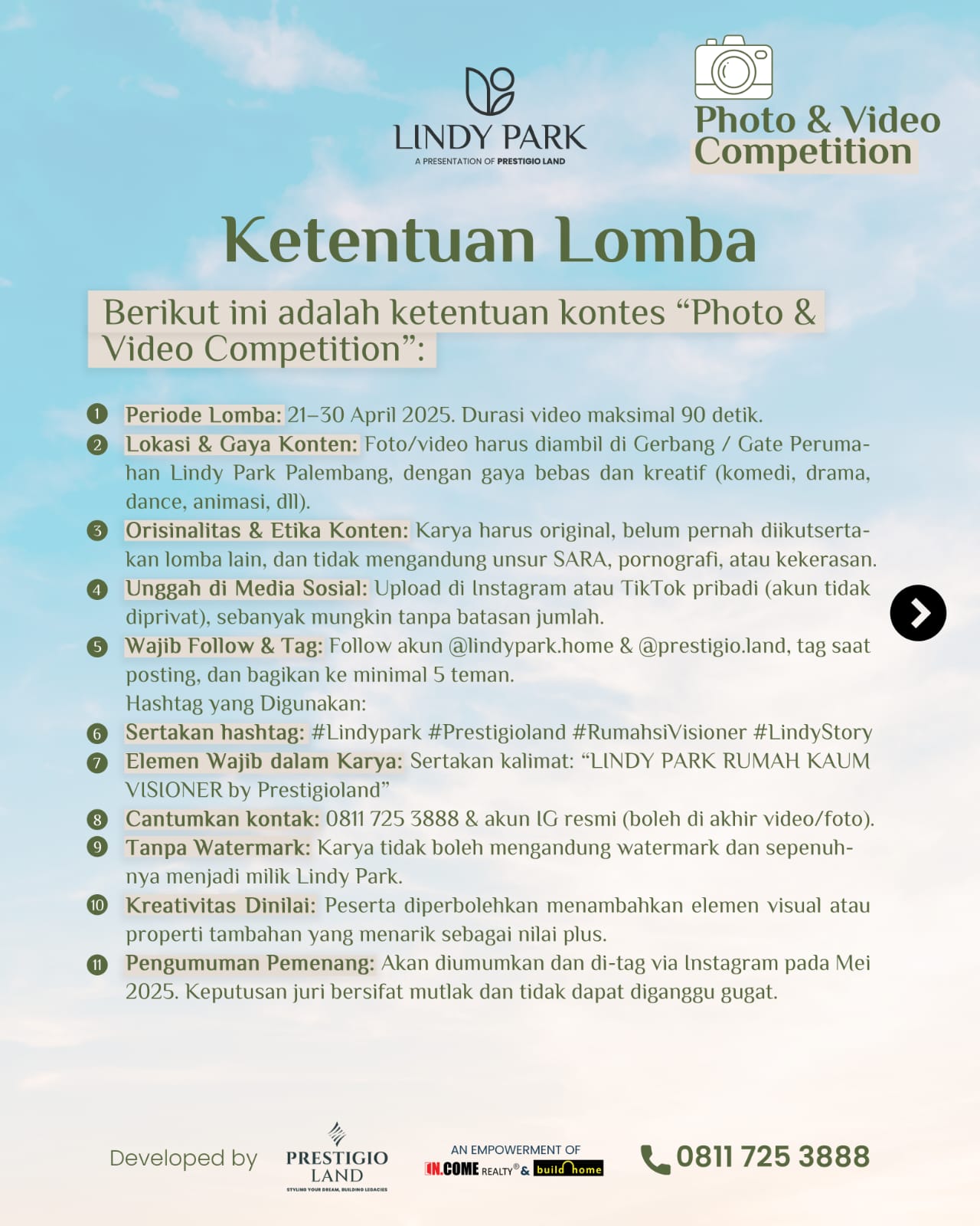 Kompetisi ini terbuka bagi siapa saja yang ingin menuangkan ide kreatifnya sekaligus memperkenalkan suasana kawasan Lindy Park Palembang yang tertata rapi, modern, dan penuh inspirasi.